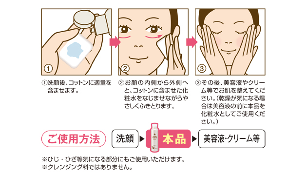 洗顔後、コットンに含ませてお肌を拭き取るだけ。