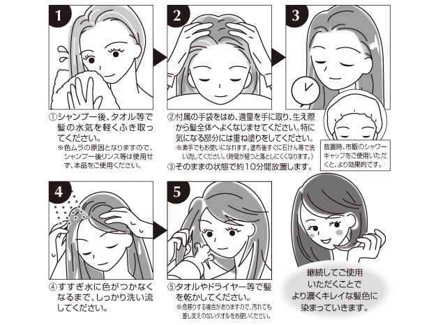 ヘアスプレー、ヘアクリーム、オイルやジェルなどをご使用されている場合は髪の表面がコーティングされている状態となりますので、染まりにくい状態となります。 その場合は一旦洗髪なさった後にご使用頂くことをおすすめいたします。 また、たくさん汗をかかれた後ですと、一度洗髪してからのご使用をおすすめいたします。 ヘアカラーを洗い流す際、再度シャンプーをすると色持ちが悪くなるのでお湯のみで洗い流すようにして下さい。