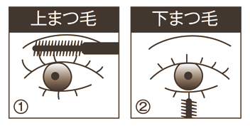①上まつ毛の根元から毛先に向かって、ブラシをジグザグと左右に動かしながら塗布します。